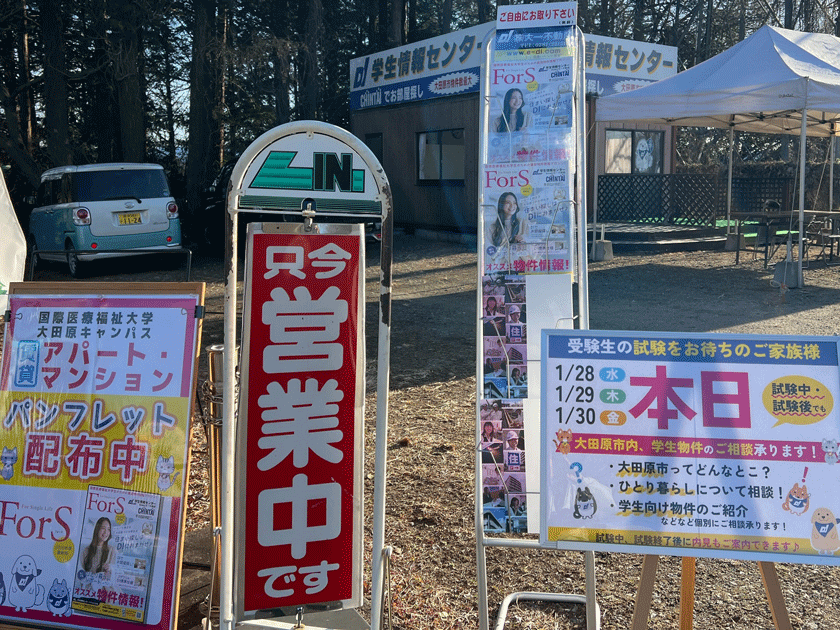 国際医療福祉大学の正門前にあります大一不動産金丸事務所では新生活スタートに向けて、ブースを設置して受験生の方や親御様のご相談を承っております。