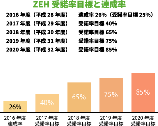 政府は「エネルギー基本計画」において、「住宅については2020年までに標準的な新築住宅で2030年までには新築住宅の平均でZEH住宅を実現する」という目標が制定されました。DI Homeでは以下のように普及目標を設定し、「ZEHビルダー」の登録を申請いたします。